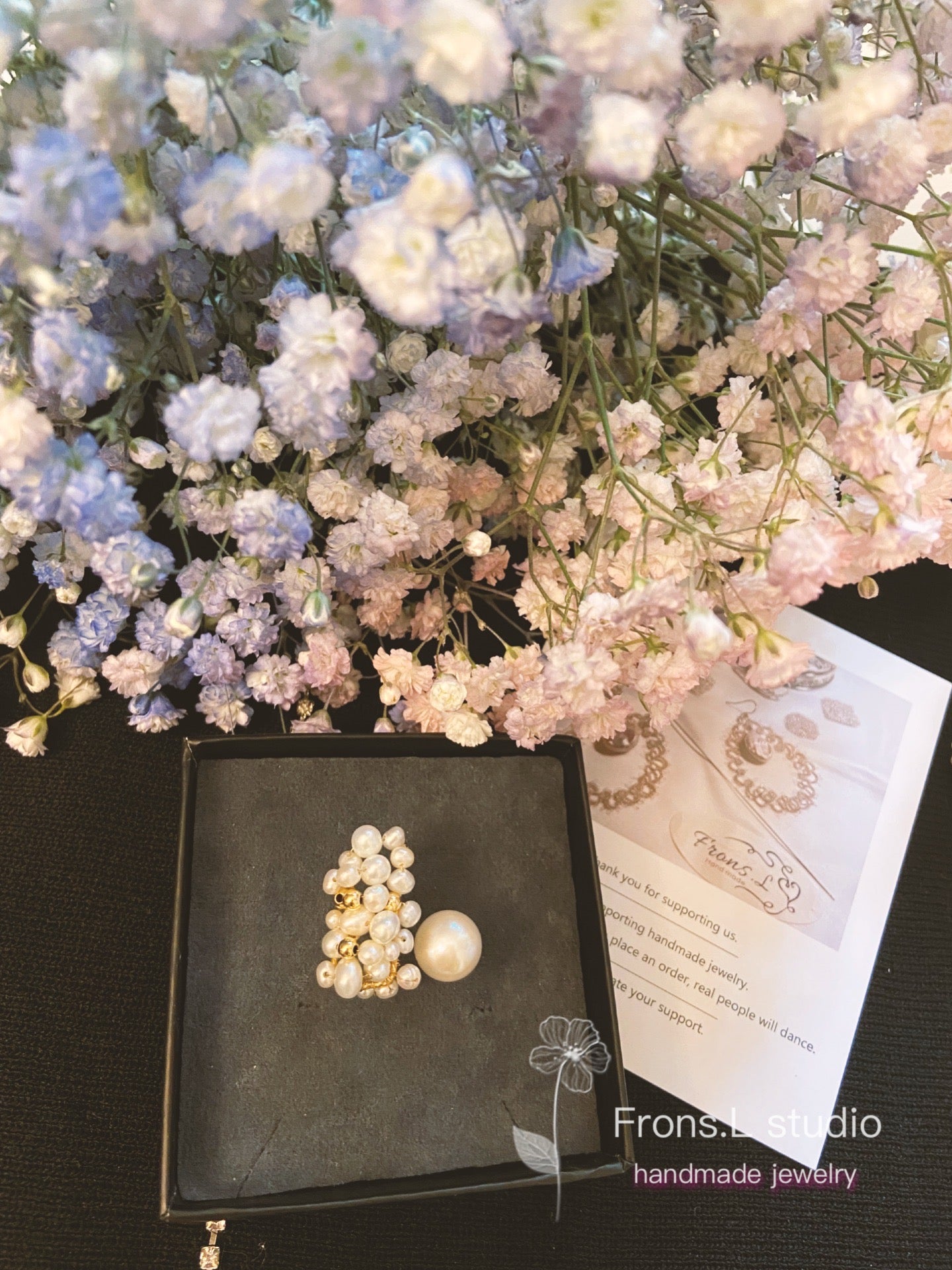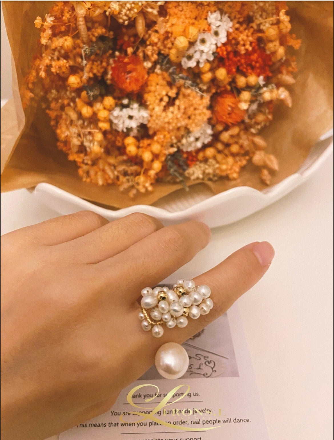 this statement ring features a gorgeous stacking baroque pearl with tiny freshwater pearls. She’s absolutely stunning solo.She comes in 3 sizes with an open front.