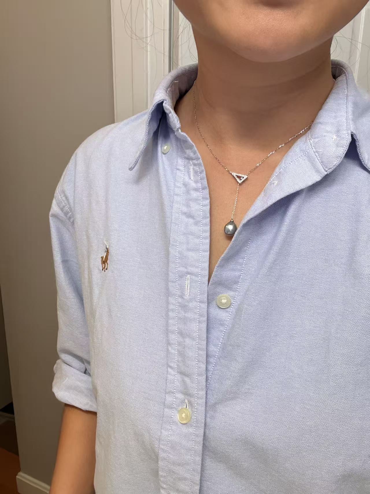 This platinum-gray Tahitian pearl necklace, drop-shaped and approximately 11-12mm, features a platinum-gray hue with a hint of green. It comes with a 45cm adjustable sterling silver Y-chain and a triangular zircon that can be pulled out to adjust the length, creating a perfectly rounded look!