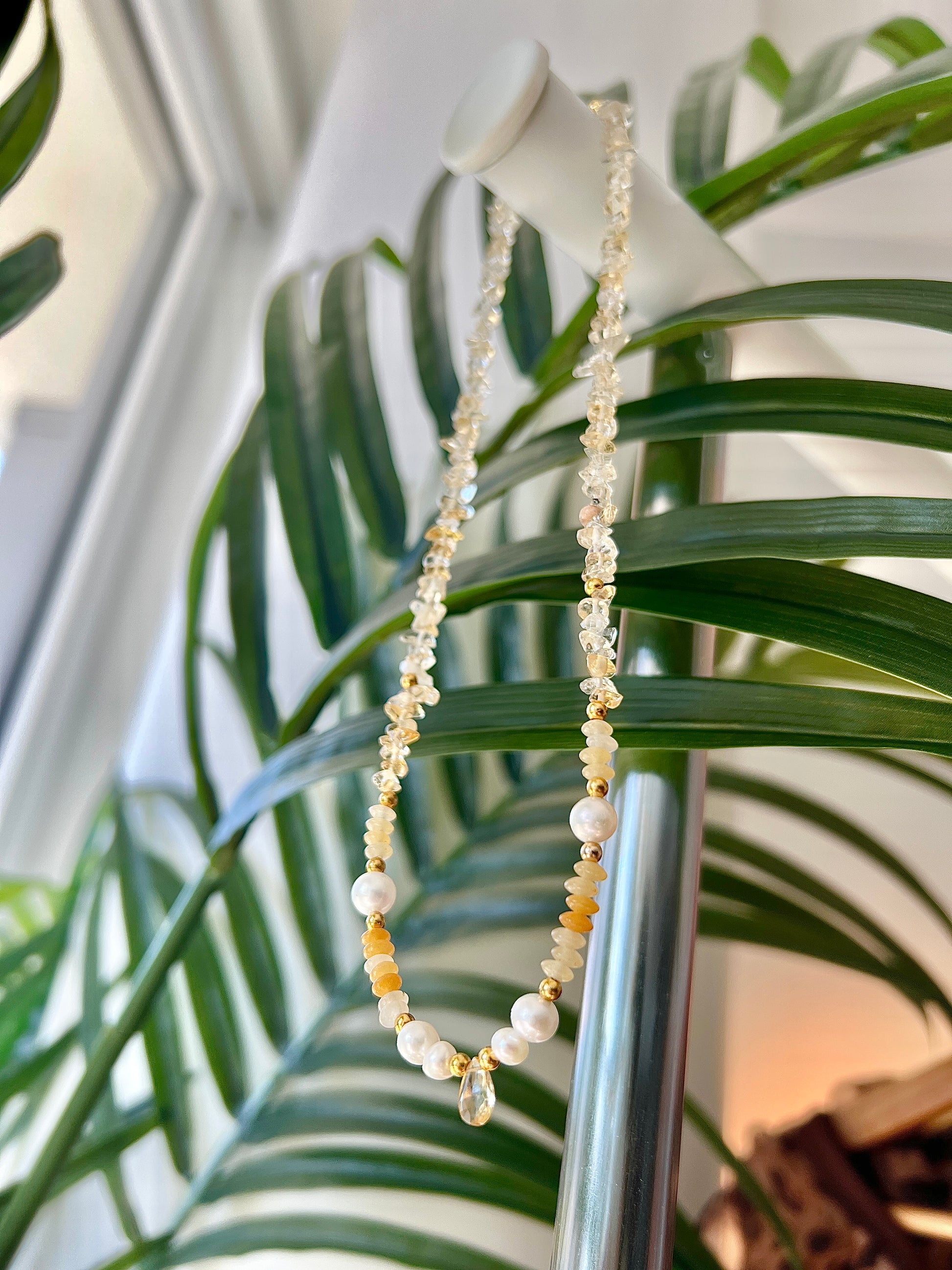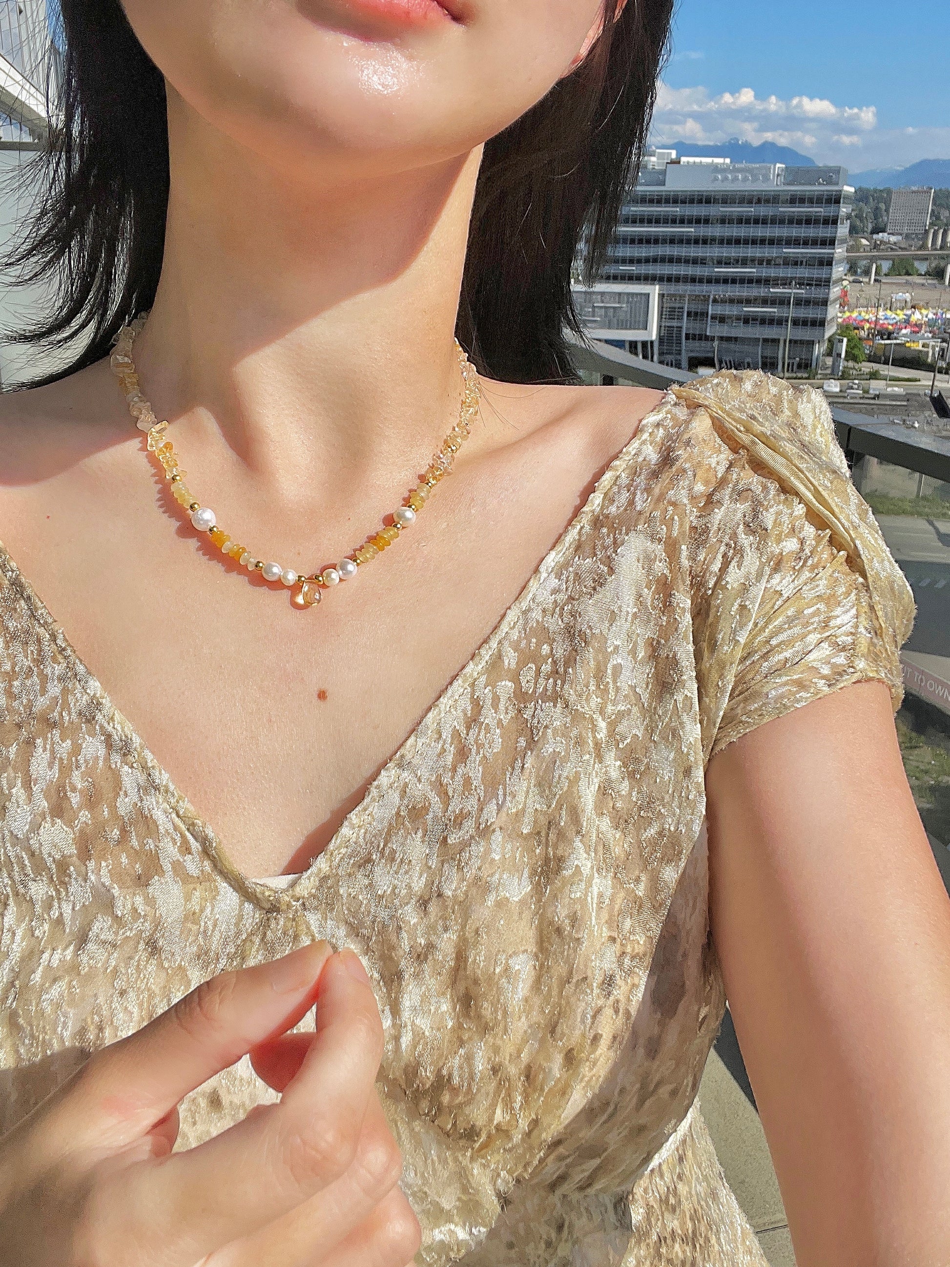 The citrinenecklace looks gorgeous on its own and can also be layered with other necklaces for a luxurious style.